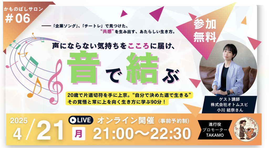 企業やチームの“想い”を言葉とメロディに乗せて届ける「企業ソング」や、社内コミュニケーションの質を高める「チートレ(チームボイストレーニング)」を展開し、“共感”を軸にした新しい働き方を切り拓いている。