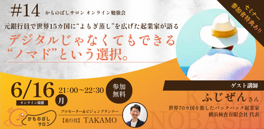 ゲスト講師は、元銀行員にして“世界を旅しながら働く”というライフスタイルを実現したふじぜんさんをお迎えします。